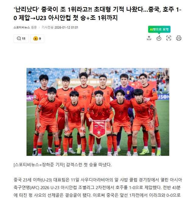 还有报道表示,太疯狂了!中国队竟然位列小组第一?一个巨大的奇迹发生了:中国队1比0战胜了澳大利亚队。很显然,大部分韩国媒体都对中国U23击败澳大利亚表达了巨大震惊,而且他们也提到了2个月前的熊猫杯,中国队曾2比0完胜韩国,而四分之一决赛很可能碰上韩国队。