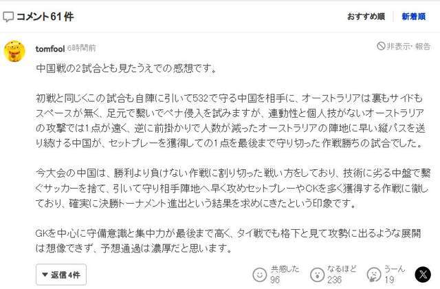 日本媒体也发布多篇报道,提到了中国队击败澳大利亚名列小组第一的消息,有日本球迷表示,看完中国队比赛后,很有感触,这是一场战略性胜利,他们全场保持防守意识和专注度,原本不被看好,现在晋级可能性很大。也有日本球迷担心:中国击败澳大利亚这出乎意料,中国队目前连胜不断,不知道会不会在比赛中遇到日本队?