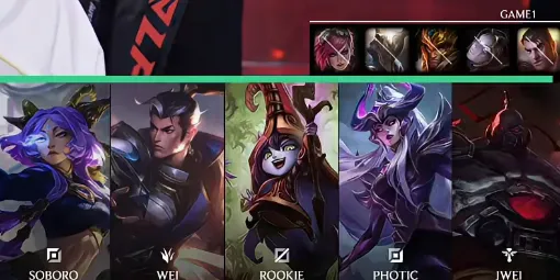 IG选用:Soboro塞恩;Wei赵信;Rookie辛德拉;Photic芸阿娜;Jwei露露